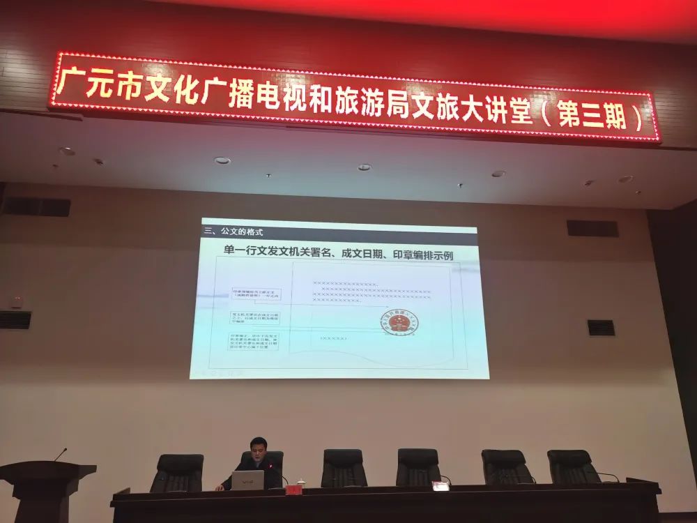2月18日,市文化广电旅游局“文旅大讲堂”(第三期)在市博物馆学术报告厅举行,市委办副主任高大海围绕机关公文处理进行了授课。局机关全体干部,直属事业单位班子成员和办公室主任等参加了本次讲座。