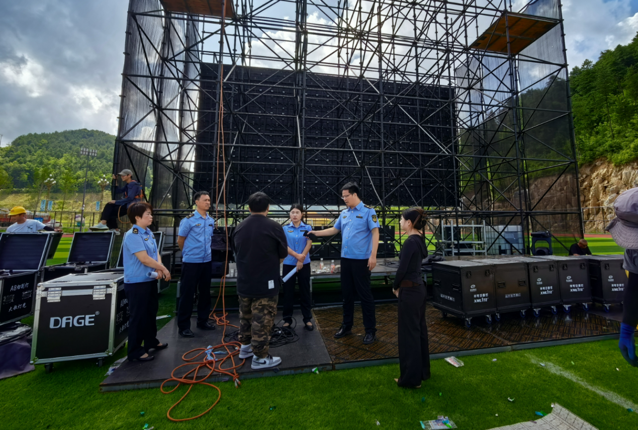 部门联动,严把演出场地设施设备安全关。为确保演出活动设施设备运行正常,整个演出活动安全顺利,市文化市场执法支队协同朝天区文化市场执法大队、朝天区公安、消防等相关职能部门召开演出活动安全检查专题部署会,并在演出前组织专业人员对演出场地的安全情况进行了全面细致检查,详细查看了解安全保卫及安全应急预案等相关资料,重点对舞台搭建的安全合规性进行检查,要求举办方确保消防器材齐全有效,疏散通道畅通无阻,为演出安全筑牢基础。
